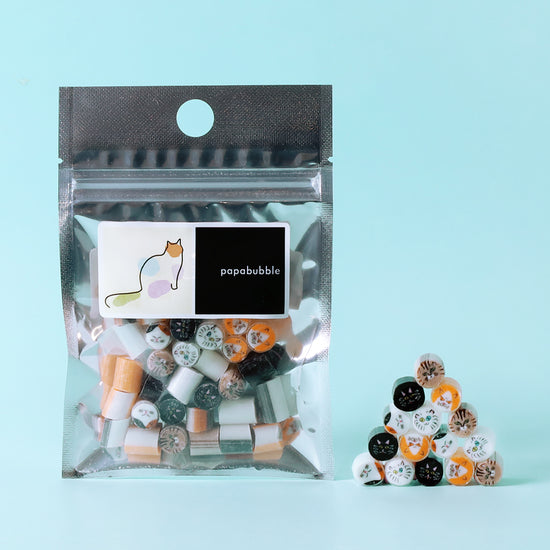 街やお家のどこかにいそうな、親しみのあるねこたちをモチーフに、それぞれ色や表情、模様の異なる個性豊かなねこキャンディに仕上げました。フレーバーは、どなたにも食べやすいフルーツフレーバーを採用しています。昼寝をしているかのように目を閉じたおだやかな表情と、ウネウネと曲がったおしゃれな髭がキュートなミケ、神秘的なオッドアイと長く伸びた髭が印象的なシロ、特有のくすみがかったベージュ色とトラ柄が特徴のキジトラ、ムスッとした目元に、ぷっくりと膨らんだ髭饅頭が少し怒ったような表情をつくるハチワレ、そして猫らしく細くなった瞳にボサボサとした毛並みが愛らしいクロ。それぞれの猫に、しっかりとした個性を持たせています。目や毛の色だけでなく、目の形や髭の表情に至るまで、すべて異なるデザインにこだわりました。中でもキジトラのくすみがかったベージュ色の再現は難しく、試行錯誤を重ねて完成させたポイントです。ねこの柄はパーツが細かく、形やサイズ、配置する角度や数まで緻密な調整が求められるため、他のモチーフと比べても難易度の高いキャンディとなっています。すべて表情が異なるため、お気に入りの一匹を見つけてお楽しみください。