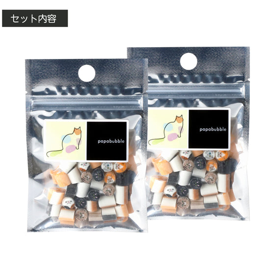 【原材料】 砂糖(国内製造)、水飴/酸味料、香料、着色料(酸化チタン、赤102、赤106、黄4、黄5、青1、青2) 【内容量】 40g×2袋 【賞味期限】 製造日より4ヵ月 【保存方法】 直射日光・高温多湿を避け、常温で保存 【注意事項】 開封後はなるべくお早めにお召し上がりください 【フレーバー】 キジトラ:パイン、クロ:コーラ、ミケ:みかん、シロ:いちご、ハチワレ:ナシ
