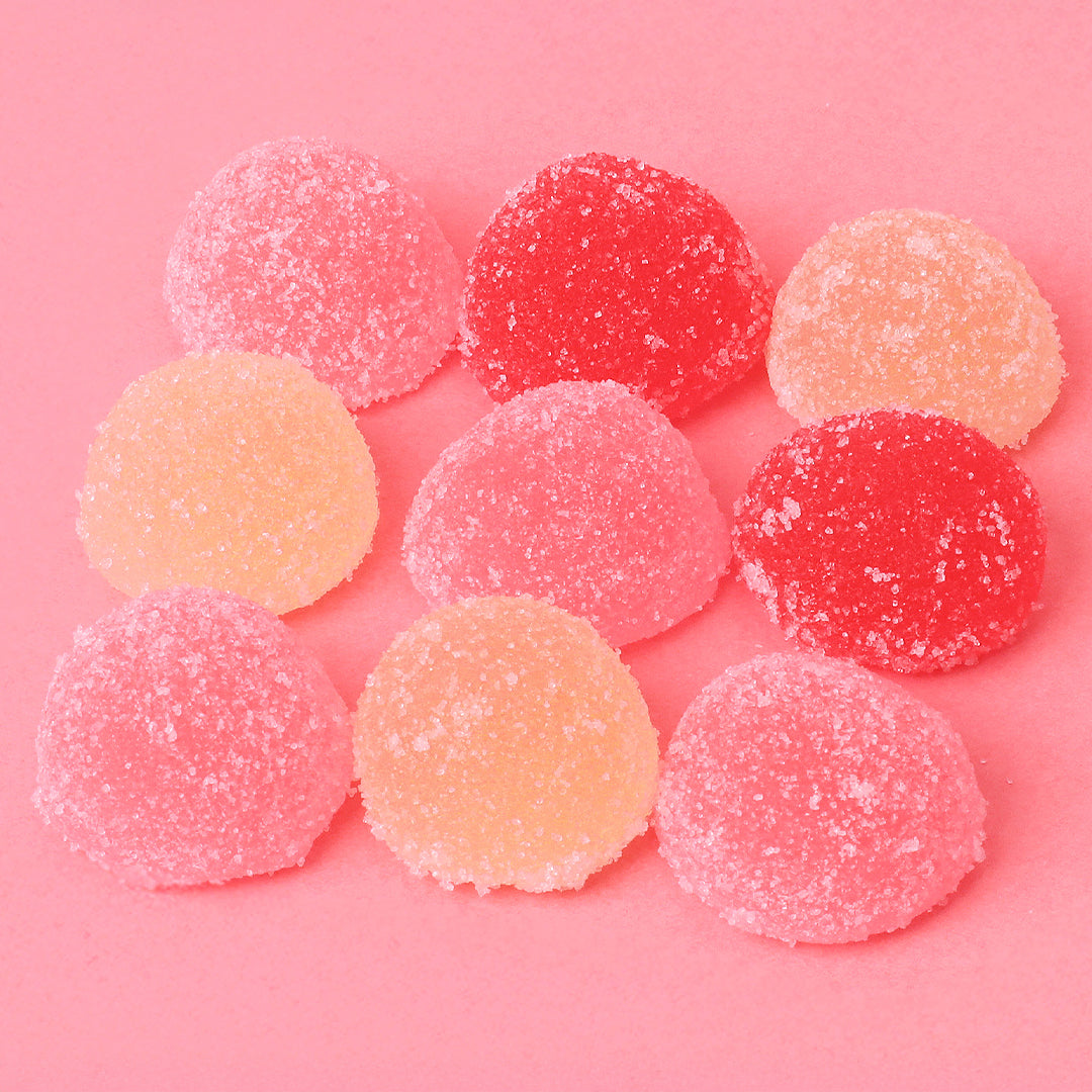 砂糖(国内製造)、水飴、濃縮果汁(苺、もも)/ゲル化剤(ペクチン)、酸味料、pH調整剤、香料、着色料(赤102、赤106、青2、紅花黄、野菜色素)、(一部にもも・りんごを含む)