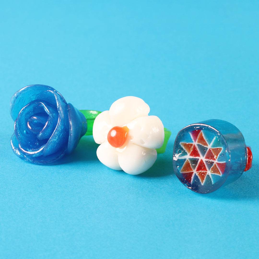 今回は、パパブブレのキャンディ職人全26名が参加。100案を超えるアイデアが集結し、コンテスト形式で商品化作品を決定しました。長年培ってきた高度な技術を生かした精巧なデザイン、リングという形状だからこそ実現した造形、さらには“虫歯予防”への願いを込めた少しユーモラスでスパイスの効いたモチーフまで、多彩な10種を厳選しています。