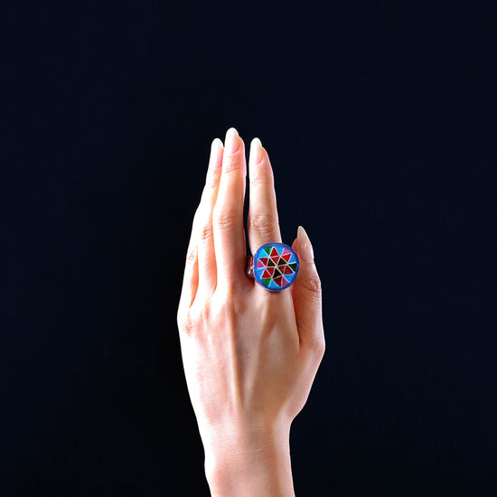 光が透けるキャンディの仕掛けを存分に発揮させた、レトロなガラス細工のようなリング