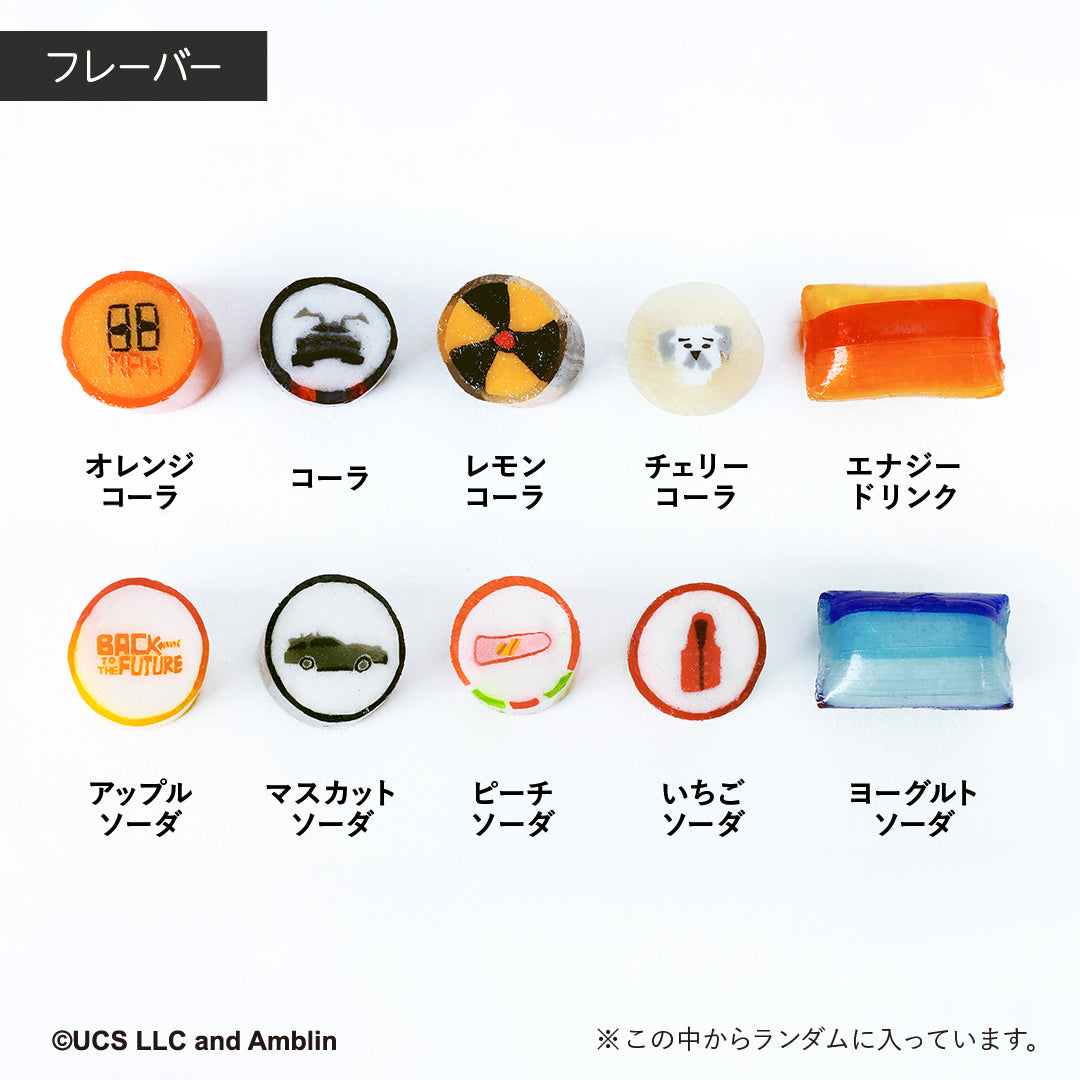主人公マーティが大好きなコーラをベースにした「キャンディA」、爽快なソーダフレーバーを集めた「キャンディB」。あの味を思わせる味わいや、未来のカフェで手に取った気分を楽しめるアレンジも加わり、口に入れた瞬間に映画の世界へタイムスリップ!