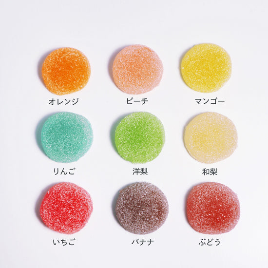 【原材料】 バブレッツ:砂糖(国内製造)、水飴/ゲル化剤(ペクチン)、酸味料、pH調整剤、香料、着色料(赤102、赤106、黄4、黄5、青1、青2)、(一部にりんごを含む) フルーツミックス:砂糖(国内製造)、水飴/酸味料、香料、着色料(赤102、赤106、黄4、黄5、青1、青2) サンキューミックス:砂糖(国内製造)、水飴/酸味料、香料、着色料(酸化チタン、赤102、赤106、黄4、黄5、青1、青2) 【内容量】 バブレッツ:9粒 キャンディ:50g×2瓶 【賞味期限】 バブレッツ:製造日より3ヵ月 キャンディ:製造日より4ヵ月 【保存方法】 直射日光・高温多湿を避け、常温で保存 【注意事項】 開封後はなるべくお早めにお召し上がりください 【フレーバー】 バブレッツ:赤:イチゴ,青:リンゴ,緑:洋梨,白:和梨,ピンク:ピーチ,橙:オレンジ,黄:マンゴー,紫:デラウェア,茶:バナナ フルーツミックス:約15種類のフルーツからランダム サンキューミックス:レモン、ピーチ、キウイ、マンゴー、いちご