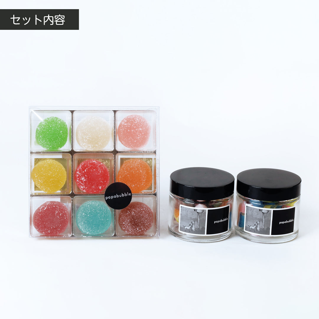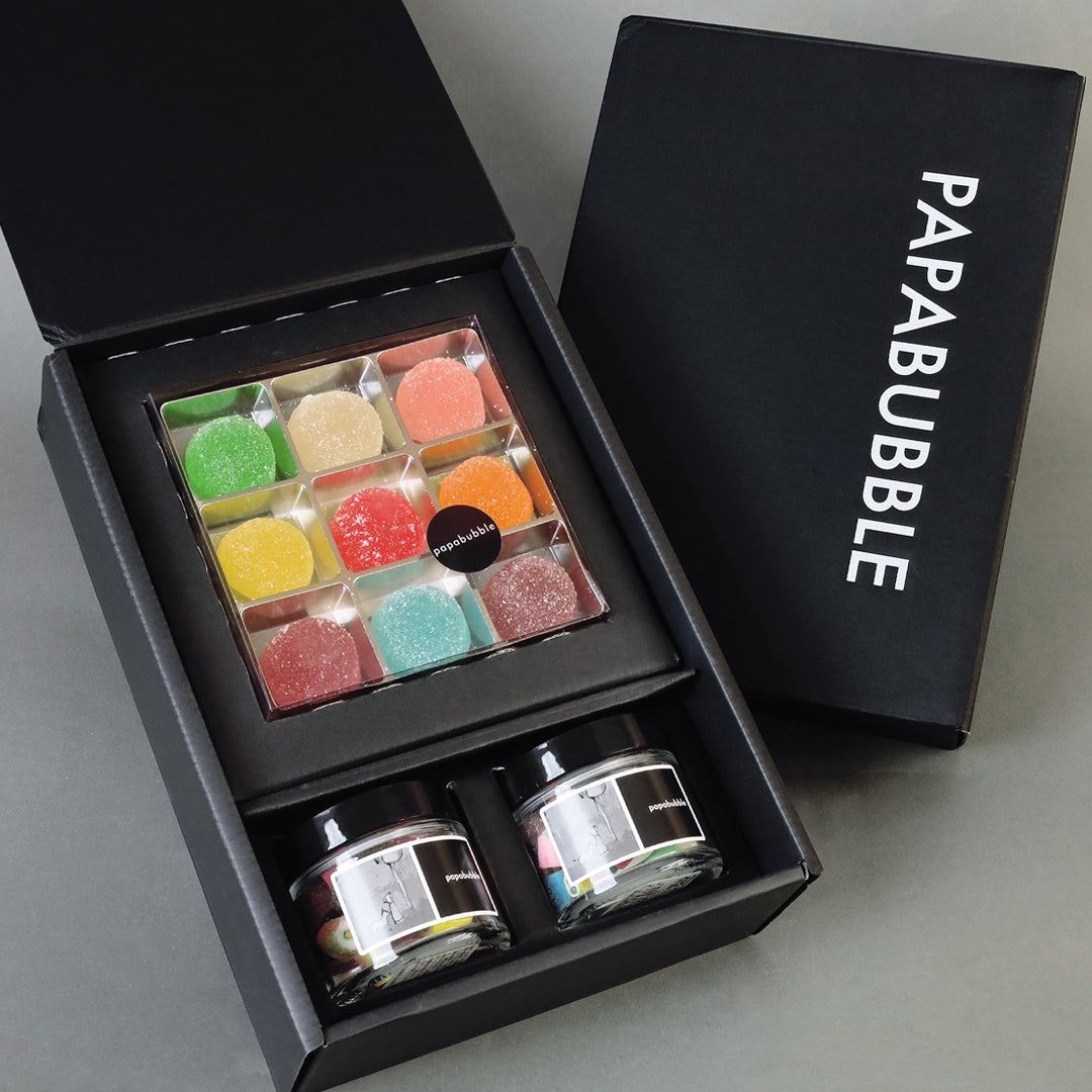 黒を基調としたシックなBOXに、大きくロゴをあしらったシンプルで洗練されたデザイン。中には、パパブブレらしいカラフルで美しいキャンディやグミが詰め込まれています。キャンディは〈BAGタイプ〉〈瓶タイプ〉〈個包装タイプ〉の3種類をご用意。まるで宝石のように輝くグミは、人気の〈バブレッツ9個入〉で登場します。キャンディとグミの魅力を詰め合わせたギフトセットは、贈る相手やご予算に合わせてお選びいただけます。これからの季節、パーティーの手土産や贈りものにもぴったりのコレクションです。