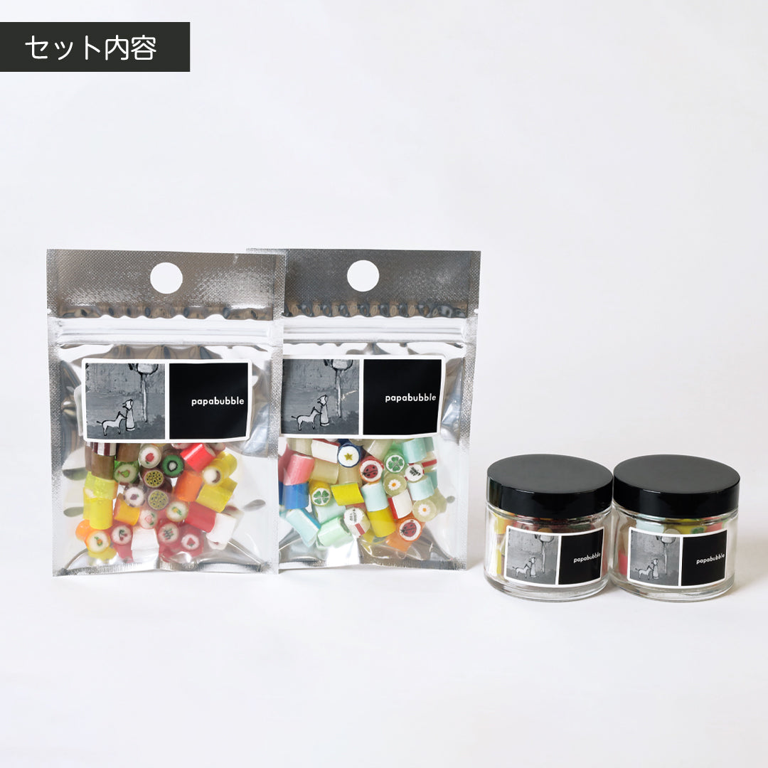 黒を基調としたシックなBOXに、大きくロゴをあしらったシンプルで洗練されたデザイン。中には、パパブブレらしいカラフルで美しいキャンディやグミが詰め込まれています。キャンディは〈BAGタイプ〉〈瓶タイプ〉〈個包装タイプ〉の3種類をご用意。まるで宝石のように輝くグミは、人気の〈バブレッツ9個入〉で登場します。キャンディとグミの魅力を詰め合わせたギフトセットは、贈る相手やご予算に合わせてお選びいただけます。これからの季節、パーティーの手土産や贈りものにもぴったりのコレクションです。