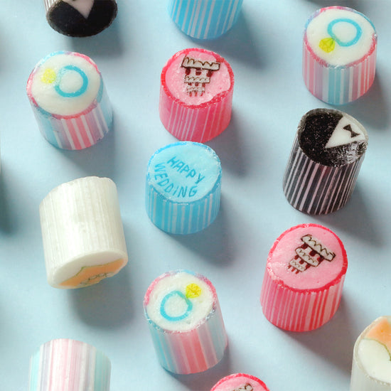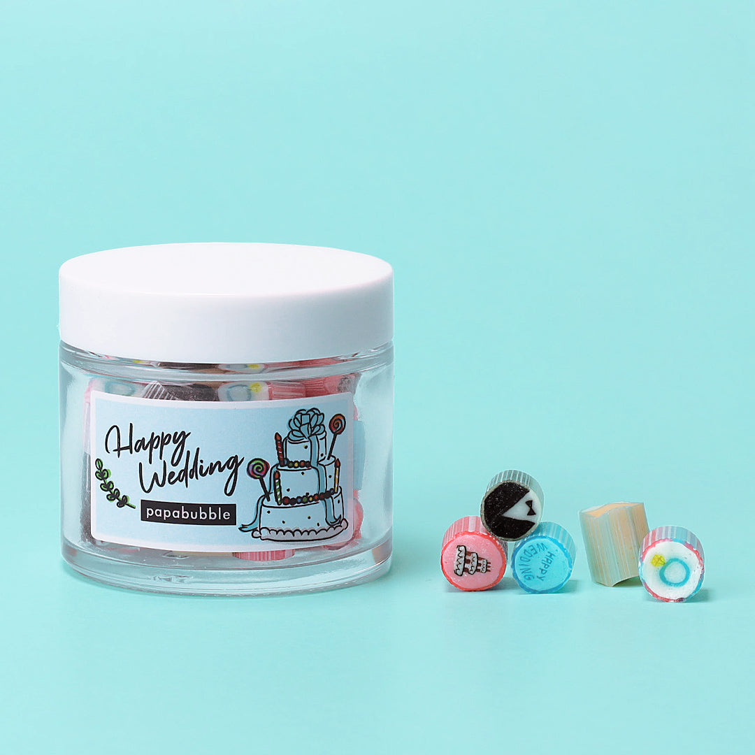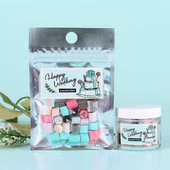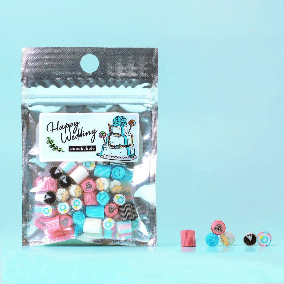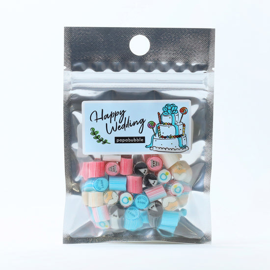 お二人の思い出や感謝の気持ちをかたちにする、ウェディング限定キャンディコレクション。オリジナルラベルや特別デザインで、披露宴や二次会、前撮りを華やかに彩り、写真映えも間違いなし。袋タイプから瓶タイプ、存在感のあるロリポップまで、シーンに合わせて選べるラインナップも魅力です。