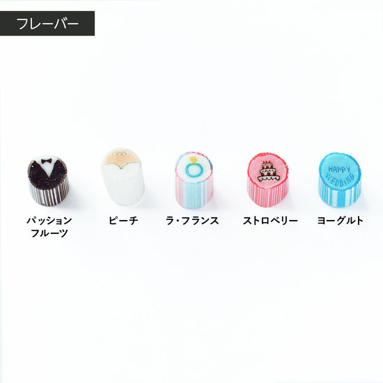 ウェディングプラン限定で展開する特別なキャンディは、「ウェディングケーキ」「結婚指輪」「HAPPY WEDDING」などのモチーフをあしらった、このプランだけのオリジナルデザインでご用意しました。