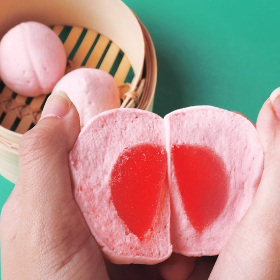 昨年人気の「中華まん」を受け、今年は新たに 「桃まん」 が仲間入り。縁起の良い点心菓子である、桃まんをモチーフに、ぷっくり・ころんとした愛らしいフォルムをマシュマロで再現しました。マシュマロには、ピーチの濃縮果汁を使用し、桃本来の香りと甘さをしっかり表現。ふんわりしたマシュマロに果実感がしっかりと乗り、軽い口当たりなのに、満足感のあるフルーティな味わいです。中には、桃との組み合わせを活かすため、爽やかで酸味のある杏子フレーバーのバブレッツを閉じ込めています。チャイナスイーツらしい甘酸っぱさと、マシュマロの優しい甘みが絶妙に調和した一品です。