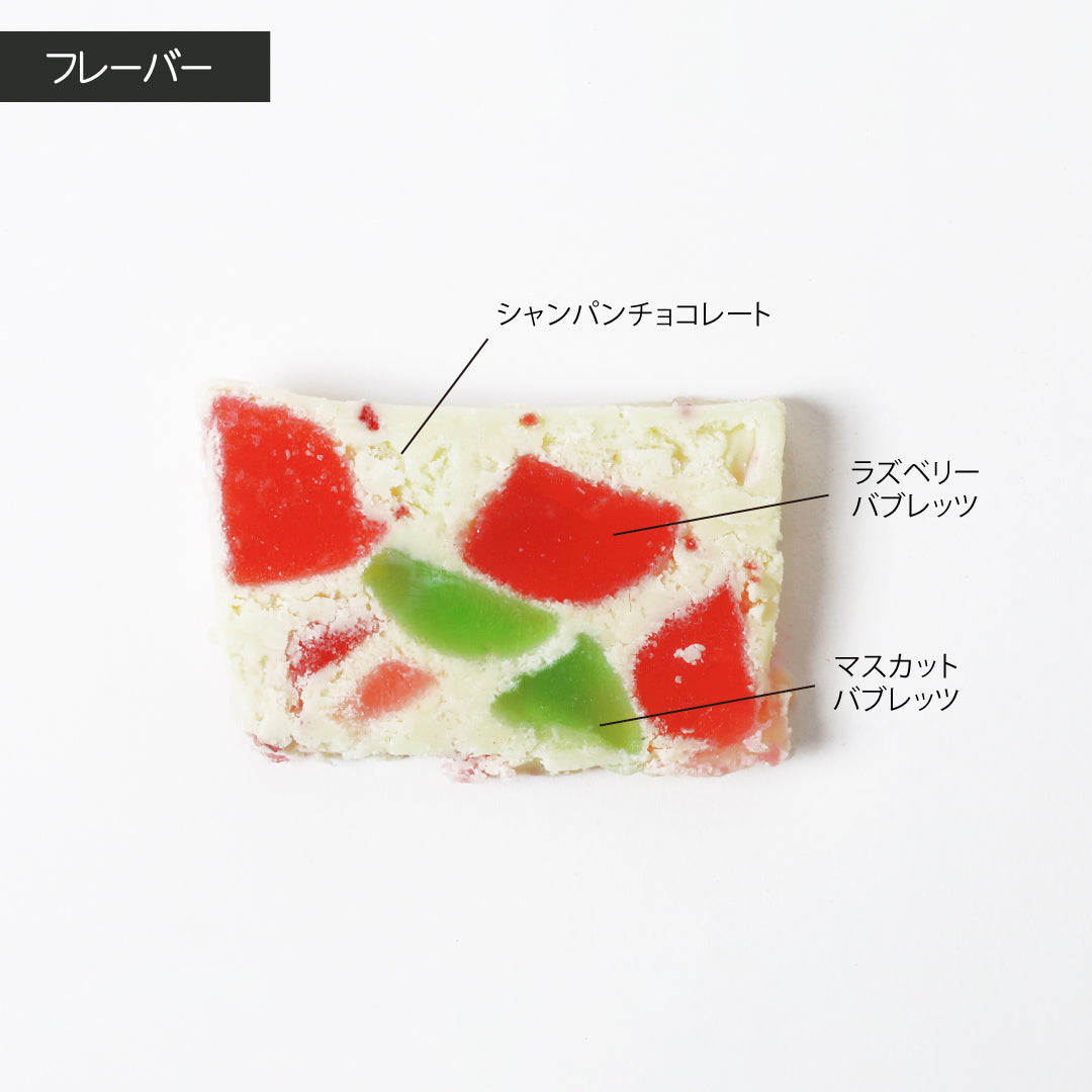 チョコレートには、シャンパンを思わせる芳醇なフレーバーを合わせ、大人のくつろぎ時間にぴったりの味わいに。グミには、通常のバブレッツよりも柔らかな食感を採用し、チョコレートとの絶妙なハーモニーを実現しました。ひと口で広がる、贅沢なマリアージュをお楽しみください。