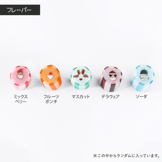 【原材料】 砂糖(国内製造)、水飴、シナモンパウダー/酸味料、香料、着色料(酸化チタン、赤102、赤106、黄4、黄5、青1、青2) 【内容量】 スノーミックス:7g×5袋 サンタミックス:7g×5袋 【賞味期限】 製造日より4ヵ月 【保存方法】 直射日光・高温多湿を避け、常温で保存 【注意事項】 開封後はなるべくお早めにお召し上がりください 【フレーバー】 (スノーミックス)青サンタ:ライチ、青雪ダルマ:ヨーグルト、青ツリー:シャンパン、結晶:クランベリーロゼ、マキナ:グリューワイン (サンタミックス)ピンク:ミックスベリー、水色:ソーダ、オレンジ:フルーツポンチ、ムラサキ:デラウェア、ミドリ:マスカット
