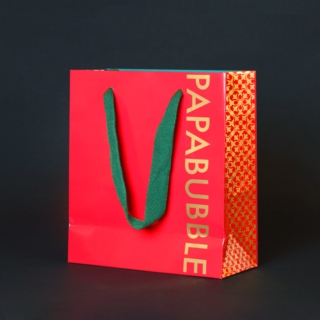 赤と緑のカラーを基調に、表と裏で異なる色合いをデザイン。側面にはスペインタイル柄を金箔であしらい、クリスマスの華やかな雰囲気に映える仕上がりです。