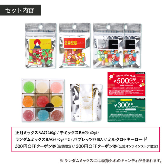 【内容量】正月ミックス:1袋午年ミックス:1袋ランダムミックス:2袋バブレッツ:9粒ミニミルクロッキーロード:1袋500円OFFクーポン:1枚