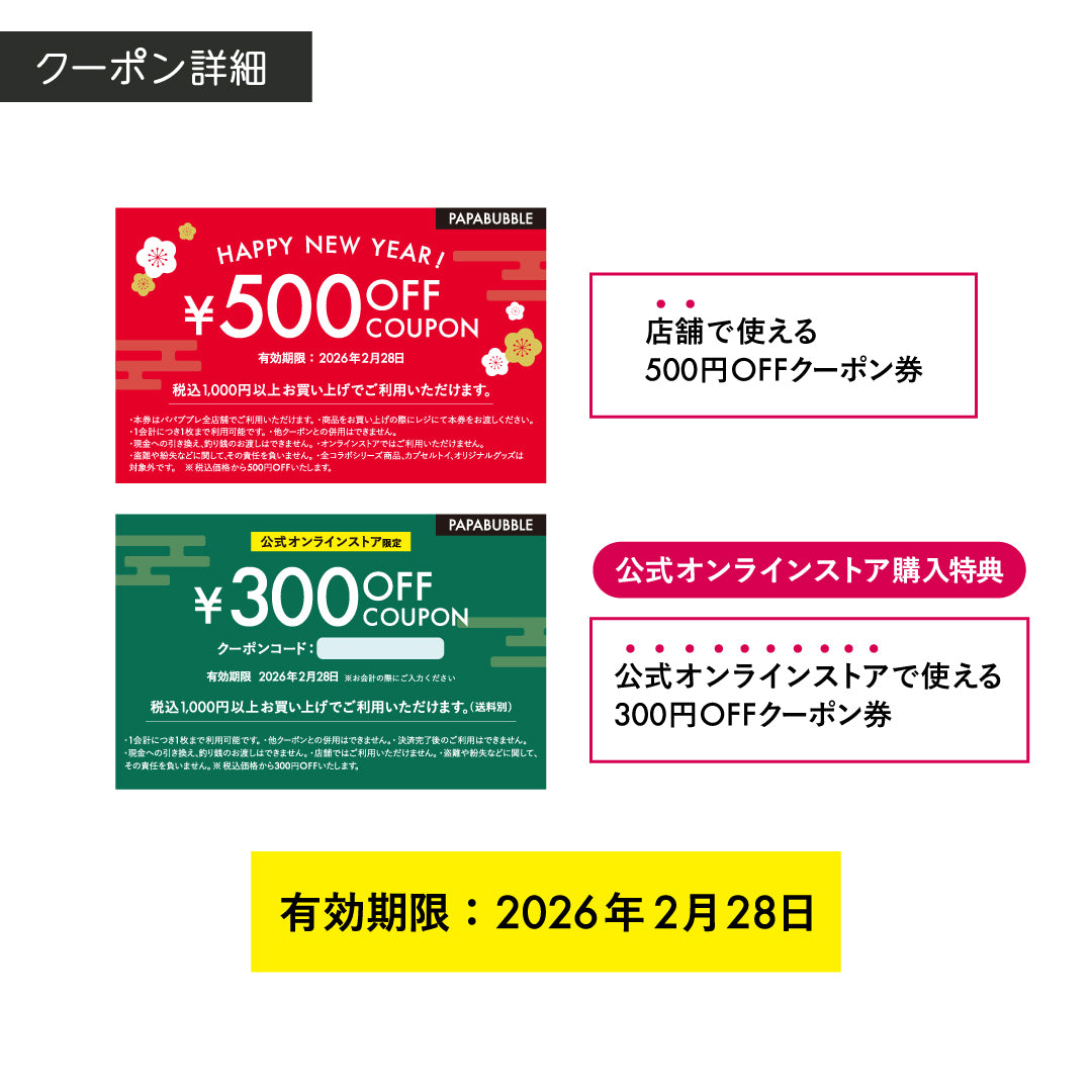 【 オンラインストア限定クーポンについて】※福袋のご購入のある1カート(1会計)につき1枚プレゼントいたします。(複数の福袋をご購入の場合でも、1枚のみの付与となります)※利用条件:1000円以上(送料別)のご購入で300円OFF※有効期限:2026/2/28まで※他クーポンとの併用はできません※現金への引き換え、お釣りの返金はできかねます※店頭ではご利用いただけません※紛失や盗難などによる再発行はいたしかねます※コラボシリーズ商品、カプセルトイ、オリジナルグッズは対象外です