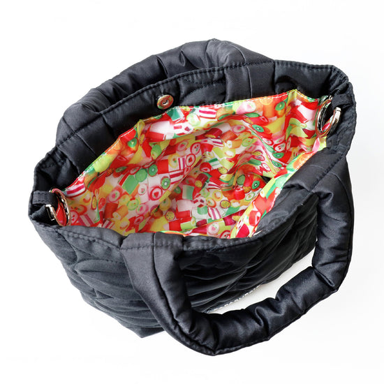 温かみのあるキルティング素材のバッグには、パパブブレの人気キャンディ柄「チェリー」をデザイン。裏地にはフルーツミックスをプリントした生地を使用しました。両端にカラビナを備え、お手持ちの紐をプラスすることで肩掛けタイプにもできる仕様です。シンプルながらもこだわりが詰まった、パパブブレらしいオリジナルアイテムとなっています。 中身には、食べ終わった後も楽しめるキャニスター入りキャンディや、正月限定キャンディなど、計6,260円相当の商品を詰め合わせました。ここでしか手に入らないキルティングバッグはファン必見のアイテムです。