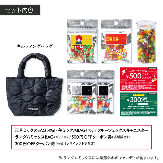 【内容量】キルティングバッグ:1個正月ミックス:1袋午年ミックス:1袋ランダムミックス:2袋キャニスターフルーツ:1個500円OFFクーポン:1枚