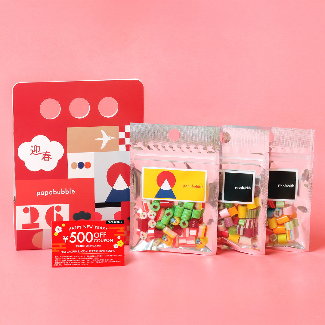 パパブブレの人気商品をお得に楽しめる3種類の福袋が登場します。キャンディ3袋が楽しめる「梅」、キャンディに加えグミも楽しめる「竹」、キャンディ・グミ・チョコレートが入った大容量の「松」をラインナップ。用途やお好みに合わせてお選びいただけます。