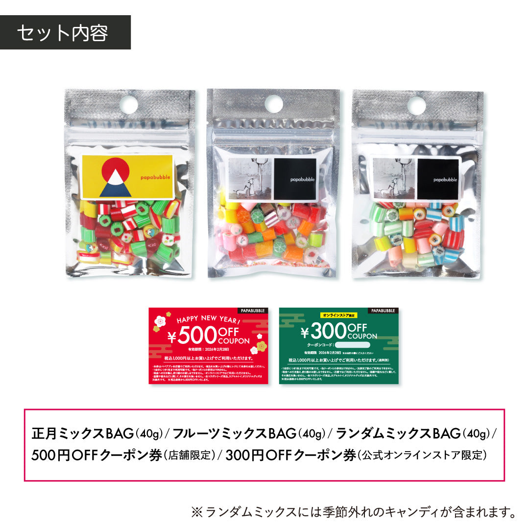 【内容量】正月ミックス:1袋ランダムミックス:1袋フルーツミックス:1袋500円OFFクーポン:1枚