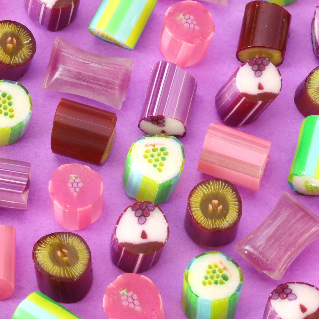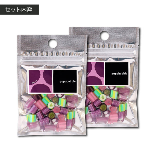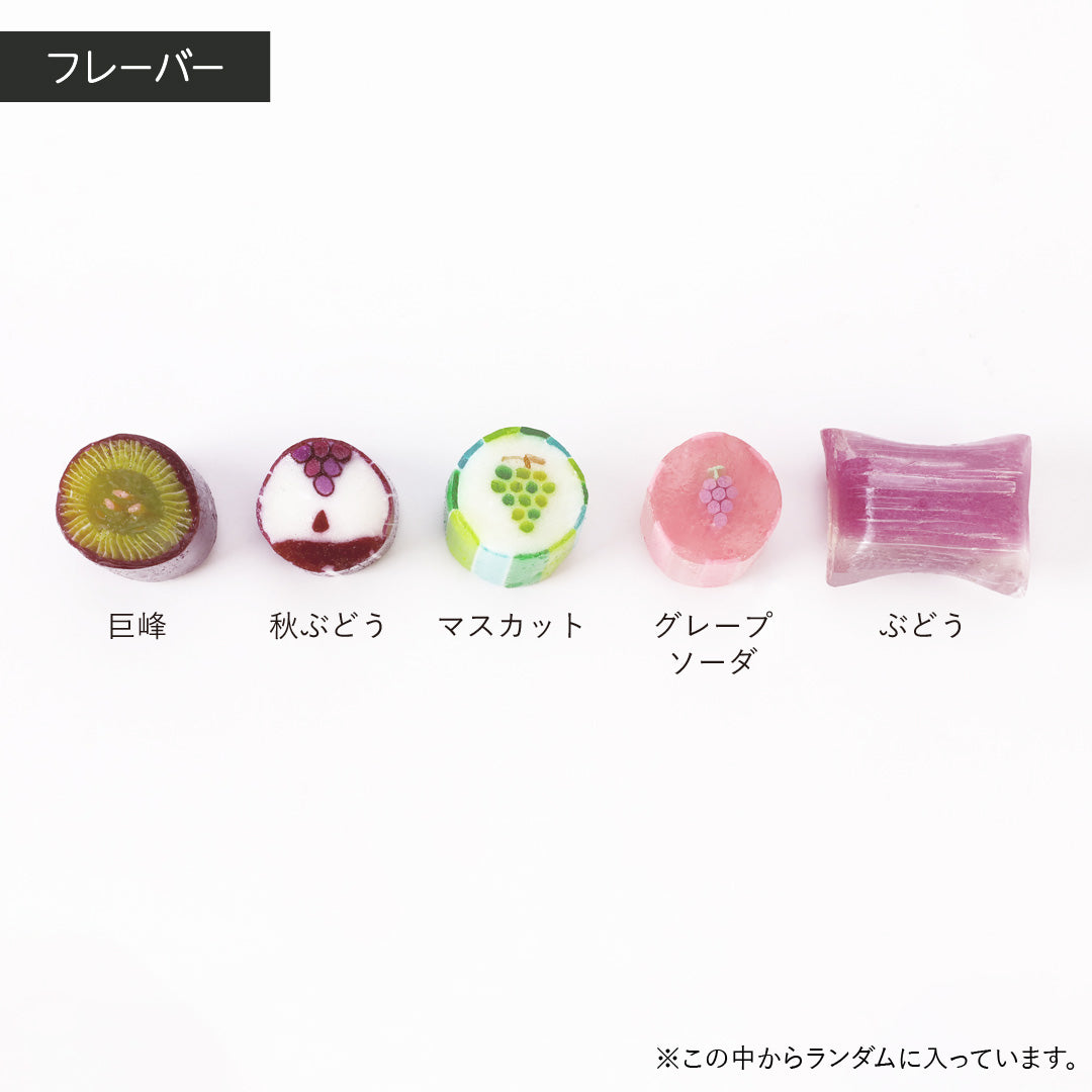 夏の終わりから秋にかけて旬を迎えるブドウとマスカット。その魅力を“味わい”と“見た目”の両方で楽しめるキャンディに仕上げました。今年のキャンディミックスのテーマは「ジューシー」。果汁が滴るようなみずみずしさや、ぷるんとした果実の質感を表現した可愛らしい枕型など、質感や形にもこだわりました。色合いは定番の紫や黄緑に加え、赤紫やピンク、黄色などの同系色を取り入れ、華やかで視覚的にも楽しめる仕上がりに。巨峰の断面を思わせる透明感のある柄など、キャンディならではの工夫で、ブドウとマスカットの“みずみずしさ”と“美味しさ”を表現しています。