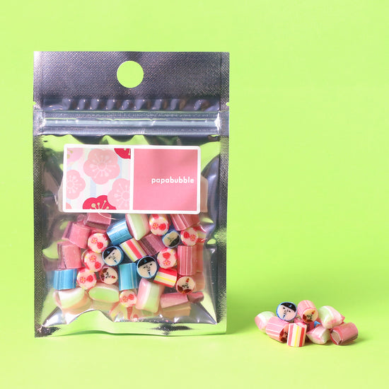 今年のキャンディは、例年とはひと味違う、パパブブレらしい遊び心を加えたデザインが特徴です。ちょっぴりシュールで個性的な表情のお内裏様とお雛様を主役にした、印象的なキャンディに仕上げました。ぼんぼりはキャンディ全体で表現し、明るい場所にかざすと、実際のぼんぼりのようにクリア部分が光る仕様となっています。桃の花は、1粒の中に白とピンクの2種をデザインし、全体の華やかさと可愛らしさを引き立てています。フレーバーは、女性に人気のある味わいを中心にセレクト。中でも新作の「アップルティーソーダ」は、ティーとソーダの組み合わせにアップルを加えることで、甘さを抑えつつもお子さまでも食べやすい、さっぱりとした味わいに仕上げています。全体的にコクのある甘さのフレーバーが多いため、噛んで食感と味の広がりを楽しんでいただくのがおすすめです。また、お内裏様とお雛様を棒付きキャンディとしてセットにした商品もご用意。写真撮影やひな祭りの演出としてもお楽しみいただけます。