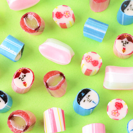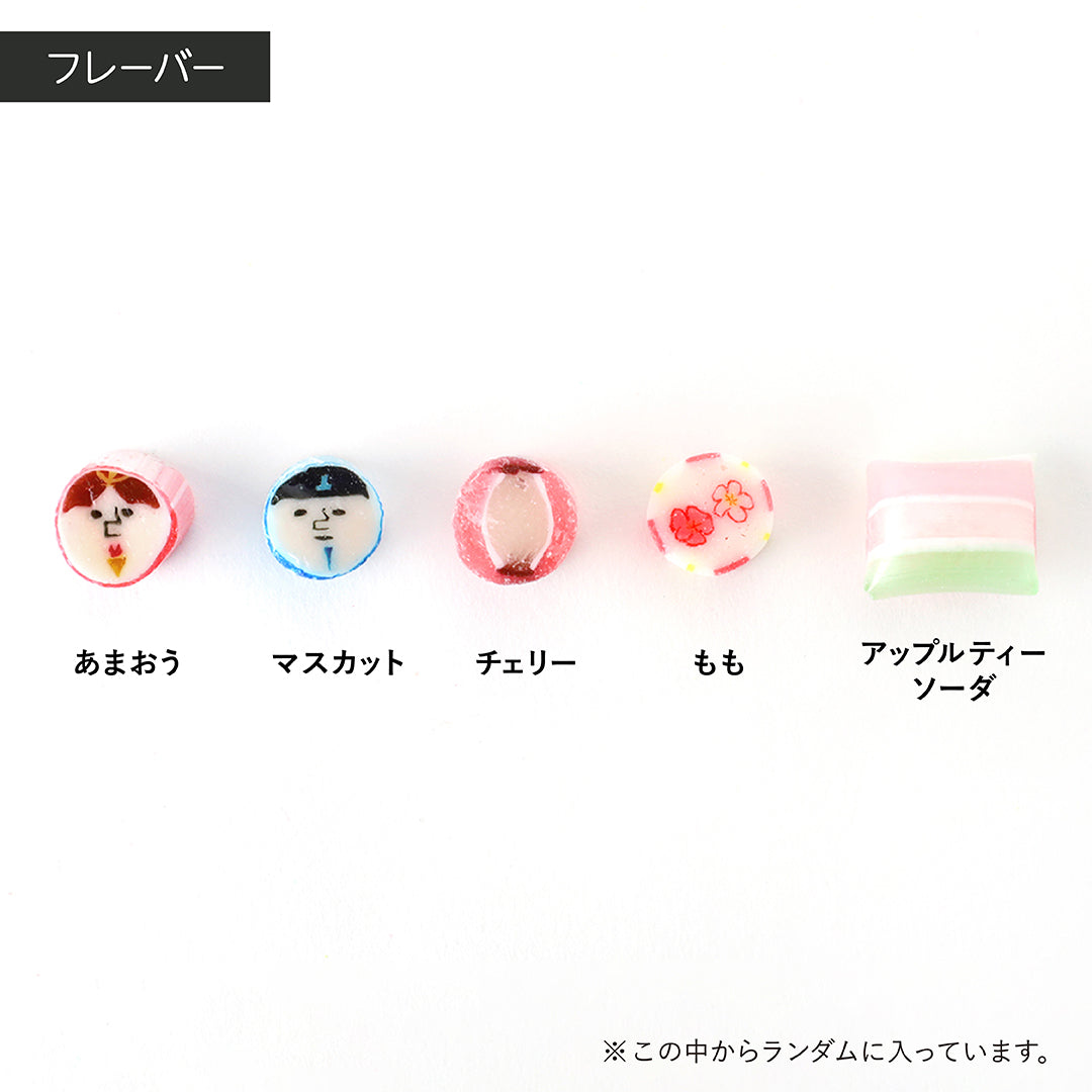 【原材料】 砂糖(国内製造)、水飴/酸味料、香料、着色料(酸化チタン、赤102、赤106、黄4、黄5、青1、青2) 【内容量】 40g×2袋 【賞味期限】 製造日より4ヵ月 【保存方法】 直射日光・高温多湿を避け、常温で保存 【注意事項】 開封後はなるべくお早めにお召し上がりください 【フレーバー】 お雛様:あまおう、お内裏様:マスカット、桃䛾花:もも、ぼんぼり:チェリー、マキナ:アップルティーソーダ