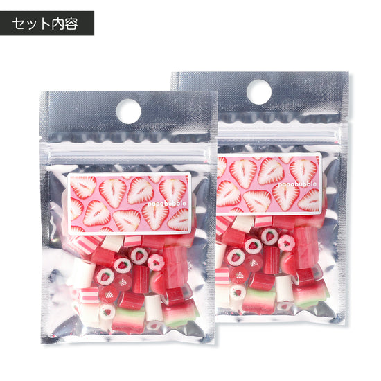 赤やピンクを基調とした中でひときわ目を引くのが、鮮やかな緑色の“枕型キャンディ”。全体のアクセントとして配置することで、視覚的にも「いちごの世界観」がよりはっきりと伝わるよう工夫しています。