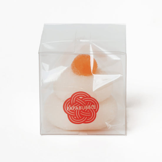 パパブブレのお正月の定番となった、鏡餅型グミ。今年一年の始まりに“福を飾る”お菓子として誕生したアイテムで、年神様をお迎えする鏡餅をモチーフに、白いお餅の上に小さな橙のみかんを乗せた愛らしいシルエットが特徴です。 見た目はおめでたく、味わいはみかんフレーバー。まさに“食べられるお正月飾り”のような縁起菓子としてお楽しみいただけます。 さらにオンラインストアでは、キャンディで作った鏡餅キャンディも販売しており、ご家族への贈り物や職場への手土産など、贈る相手やシーンに合わせてお選びいただけます。