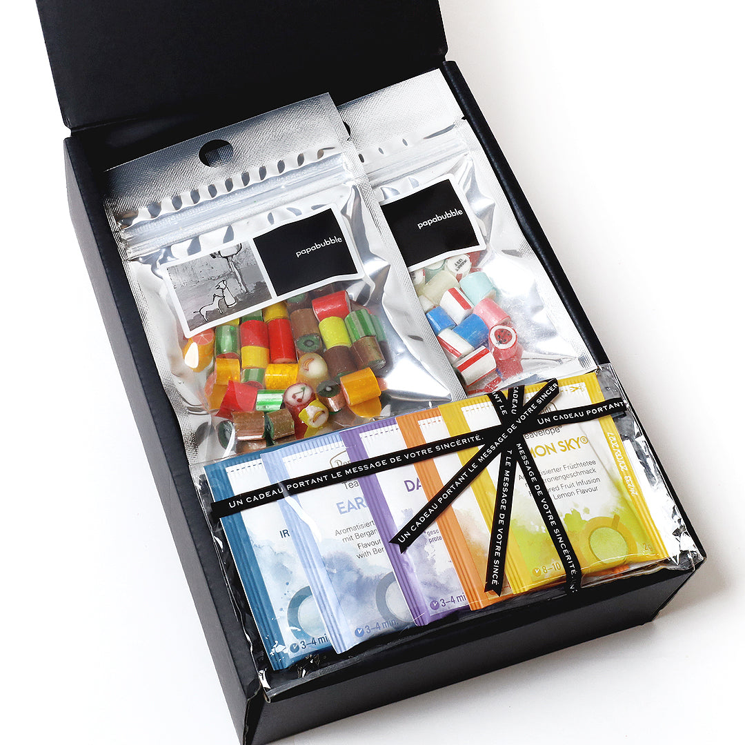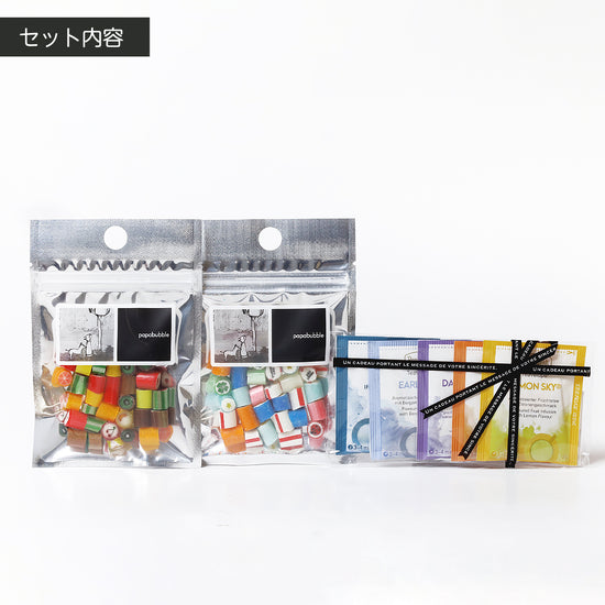 【原材料】 フルーツミックス:砂糖(国内製造)、水飴/酸味料、香料、着色料(赤102、赤106、黄4、黄5、青1、青2) サンキューミックス:砂糖(国内製造)、水飴/酸味料、香料、着色料(酸化チタン、赤102、赤106、黄4、黄5、青1、青2) 紅茶:[レモンスカイ]リンゴ(アルバニア)、スイートブラックベリーの葉、炒りチコリの根、ローズヒップ、レモングラス、レモンピール/酸味料、香料(レモン)、(一部にりんごを含む)[ルイボスバニラ]ルイボス(南アフリカ、EU)/香料(バニラ)【ブラックティー】[アッサム・ダージリン]紅茶(インド)【フレーバーブラックティー】[アールグレイ]紅茶(インド、ヨーロッパ)/香料(ベルガモット) 【内容量】 キャンディ:40g×2袋 紅茶:5袋 【賞味期限】 製造日より4ヶ月 【保存方法】 直射日光・高温多湿を避け、常温で保存 【注意事項】 開封後はなるべくお早めにお召し上がりください 【フレーバー】 フルーツミックス:約15種類のフルーツからランダム サンキューミックス:レモン、ピーチ、キウイ、マンゴー、いちご 紅茶:アッサム・ダージリン1.5g×2袋,レモンスカイ2g×1袋,ルイボスバニラ1.5g×1袋,アールグレイ1.5g×1袋