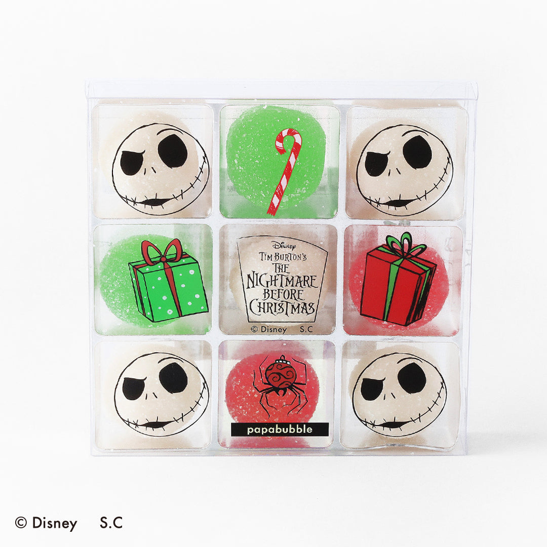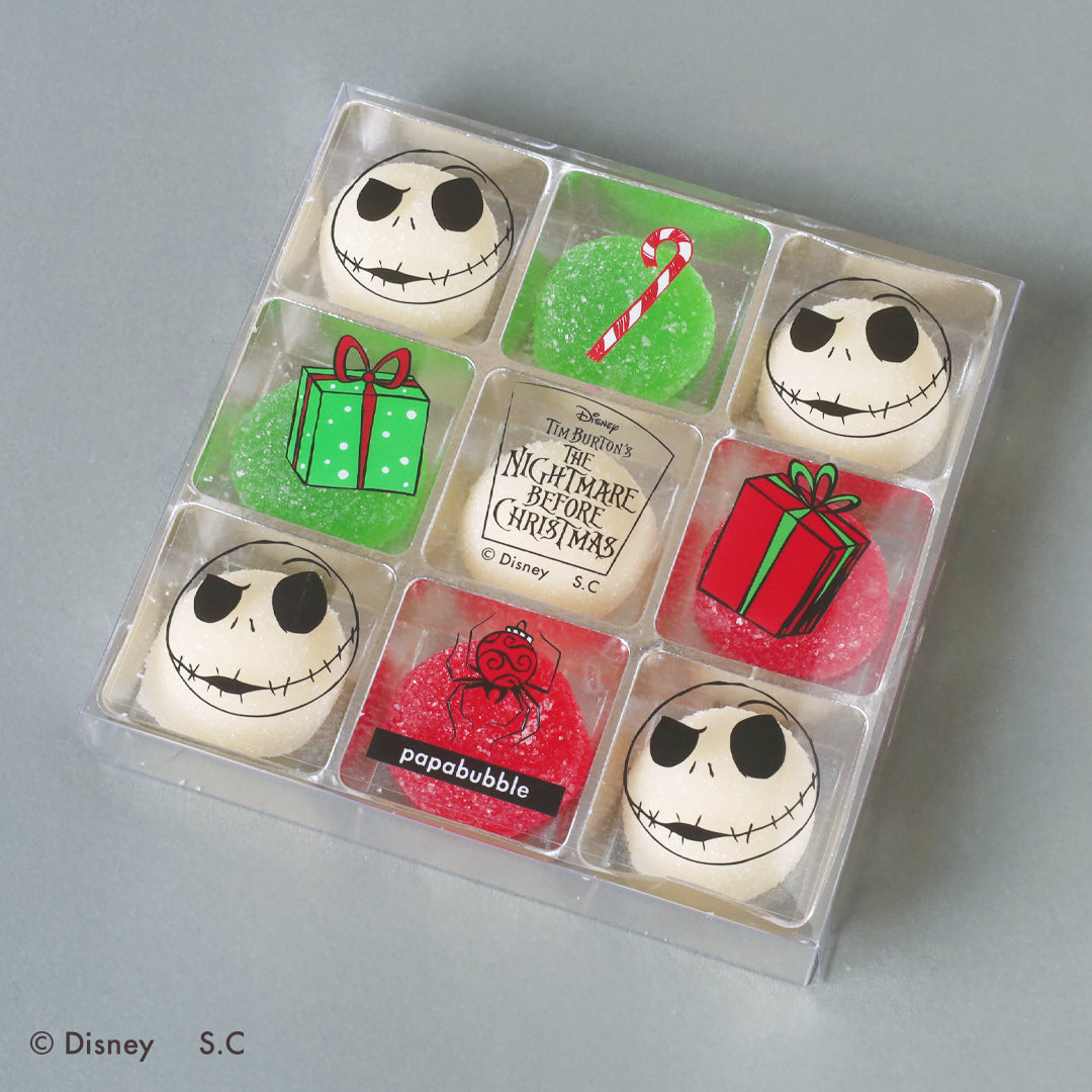 ホワイトソーダ味の白いグミを「ジャック」の顔に見立てたデザイン。映画の世界から抜け出してきたような存在感で、思わず食べるのをためらってしまうほどワクワクする一品です。赤と緑を基調としたクリスマスカラーがホリデー気分を盛り上げ、冬のギフトにもぴったりのアイテムです。