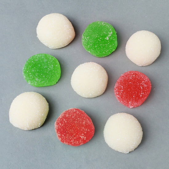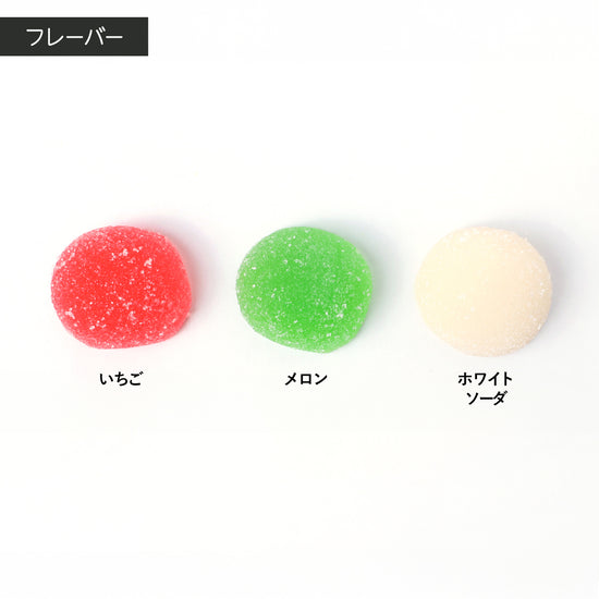 【原材料】 砂糖(国内製造)、水飴/ゲル化剤(ペクチン)、酸味料、pH調整剤、香料、着色料(酸化チタン、赤102、赤106、黄4、青1、青2)、(一部にりんごを含む) 【内容量】 9粒 【賞味期限】 製造日より3ヵ月 【保存方法】 直射日光・高温多湿を避け、常温で保存 【注意事項】 開封後はなるべくお早めにお召し上がりください 【フレーバー】 赤:あまおう、緑:メロン、白ホワイトソーダ