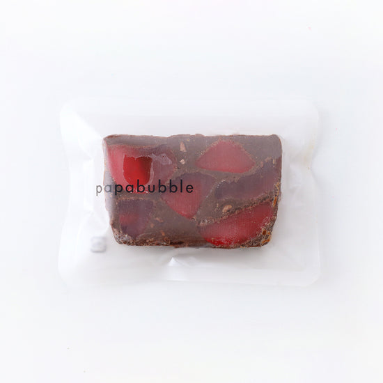ミルクチョコのコクのある甘さにラズベリーグミ入りのバブレッツを加え、チョコだけでもグミだけでも味わえない“食感の驚き”を実現しました。パッケージ越しには宝石のように透けるラズベリーの赤を配置し、見た瞬間にトキメキが生まれるビジュアルです。