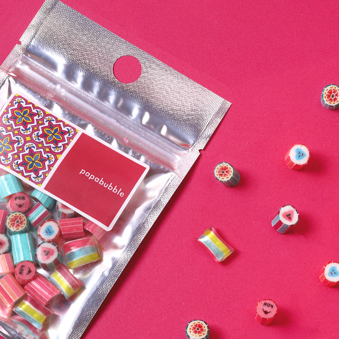 「FOR U」の文字キャンディは、Uを“ぷるんとしたくちびる”に見立てたユニークなデザイン。