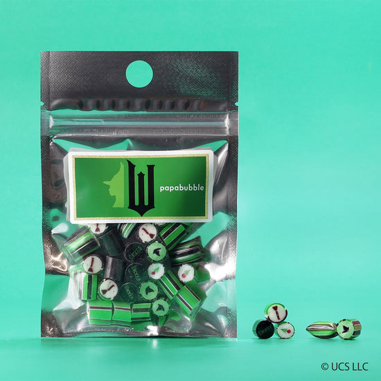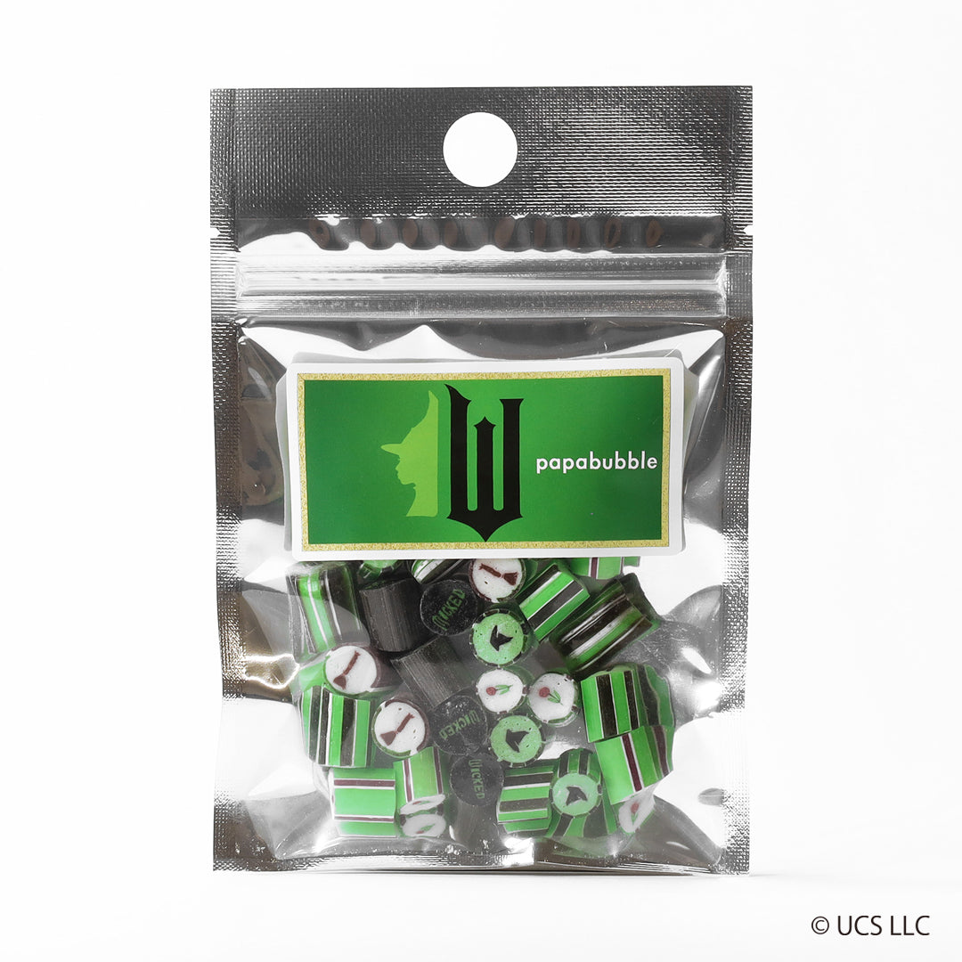 全体をエルファバの象徴的なカラーであるグリーンとブラックでまとめ、作品のロゴを忠実に再現しました。映画の中で重要な意味を持つ帽子・箒・ケシの花といったモチーフを、キャンディの柄として丁寧に落とし込んでいます。中でもケシの花は、物語において「眠り」や「支配」を象徴する印象的な存在として、ファンの記憶に深く残るモチーフ。また、帽子と箒はエルファバを語るうえで欠かせない象徴として採用しました。味わいは、見た目の印象とリンクさせた、エルファバの「緑」をイメージしたフレーバーで統一しています。映画を観ながら、観る前や観た後の余韻として。手に取るたびにエルファバの存在を感じられるキャンディです。